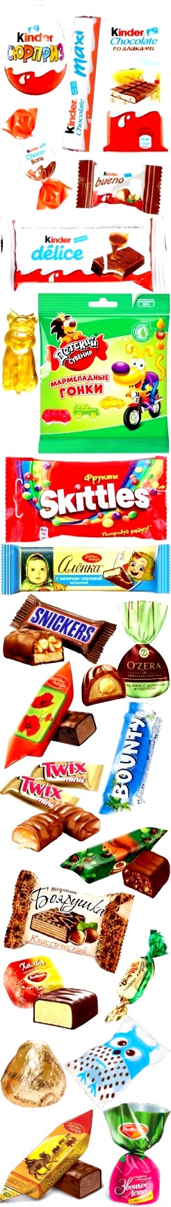 Киндер Сюрприз (1 шт), Киндер Макси (1 шт), Киндер Кантри (со злаками) (1 шт), Киндер Делиз (1 шт), Киндер Бонс мини (1 шт), Киндер Буено мини (1 шт)